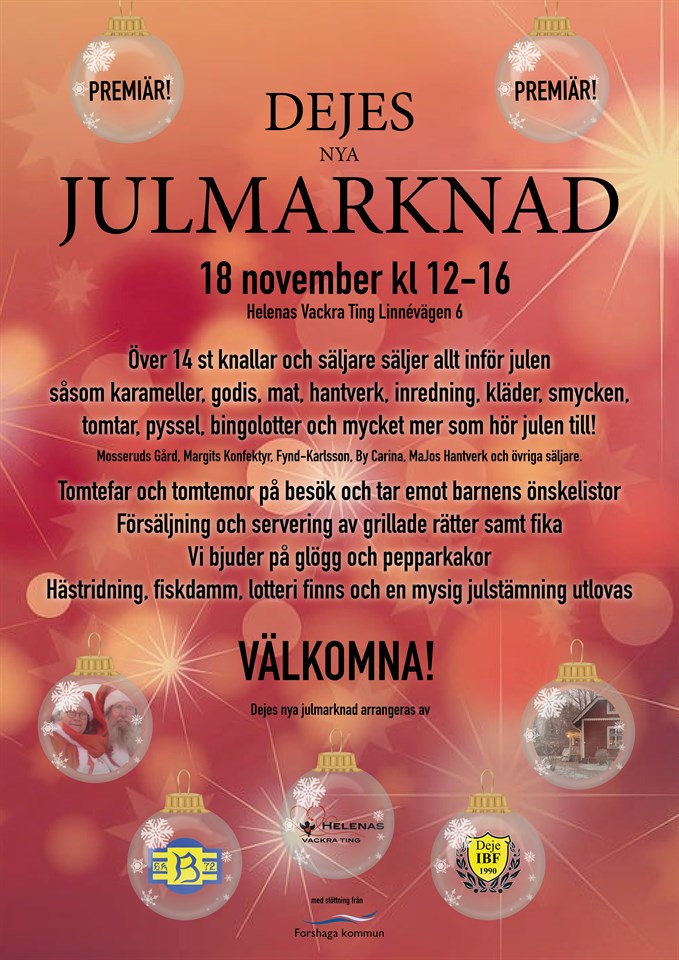 Välkomna till premiären för Dejes helt nya julmarknad - arrangerad av föreningslivet och näringslivet! Över 14 st knallar och säljare säljer allt inför julen såsom karameller, godis, mat, hantverk, inredning, kläder, smycken, tomtar, pyssel, bingolotter och mycket mer som hör julen till! Tomtefar och tomtemor på besök och tar emot barnens önskelistor - Försäljning och servering av grillade rätter samt fika - Vi bjuder på glögg och pepparkakor - Hästridning, fiskdamm, lotteri finns och en mysig julstämning utlovas Dejes nya julmarknad arrangeras av HK Brukspöjkera, Deje IBF, Helenas Vackra Ting 18 november kl 12-16 Linnévägen 6, Deje VÄLKOMNA!