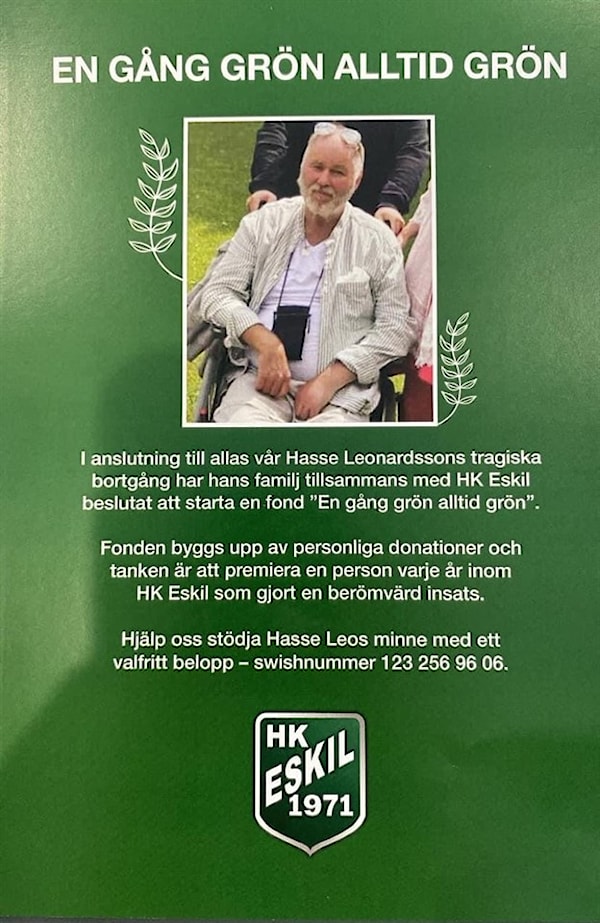 Inga blommor tack, men möjlighet att ge ett bidrag via swishnummret nedan till en fond i Hasses minne ”En gång grön alltid grön”, kommer att finnas på minnesfikat.