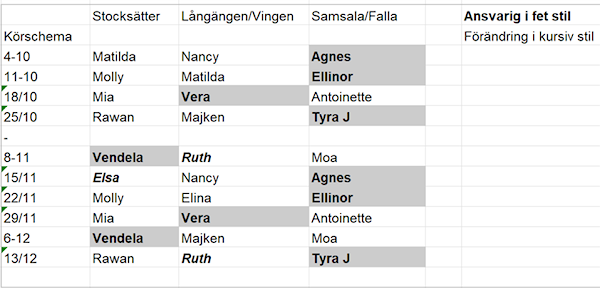 De markerade namnen i fet text är ansvariga för dagens körning, de ska meddela de andra och påminna om körningen några dagar innan så att alla har koll!