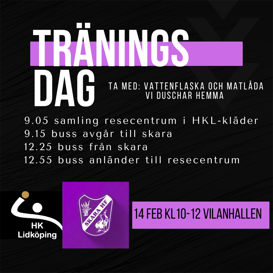 Vi ses 9.05 på resecentrum. Buss 200 tar oss till skara: avgång 9.15 (lagkassan står för bussbiljett för de som inte har busskort) Kom ombytt och ta med vattenflaska, inneskor och lunchlåda Vi har gemensamma aktiviteter i Vilanhallen med tjejerna i Skara HF kl 10.00-12.00 Buss från Skara kl 12.25 och vi ska vara tillbaka på resecentrum 12.55 Ses på onsdag F14 10 feb 2024 0kommentarer