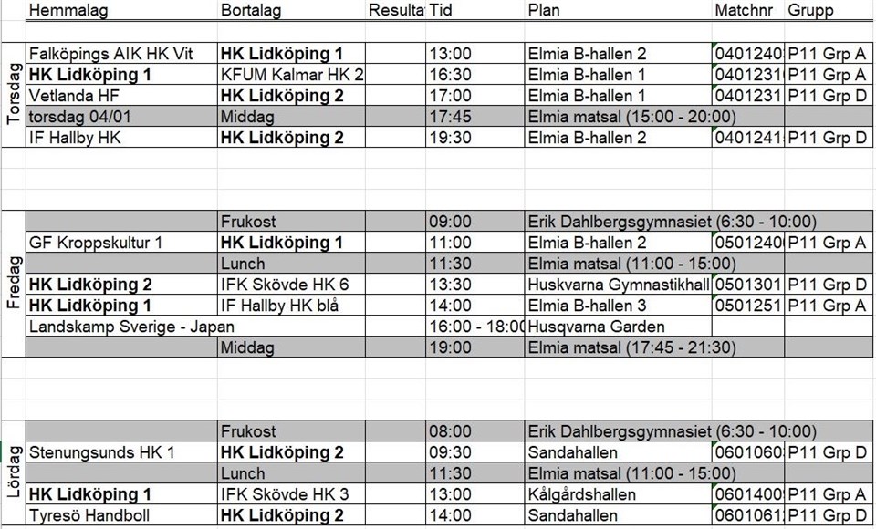 Om inte alla fått schemat som Fredrik delade via Supertext kommer det även här i bifogad bild. Schemat är lättare att zooma in och läsa via webbläsare jämfört med appen eller om ni når det via Supertextgruppen. Tiderna är på ett ungefär och om inget ändras i t.ex. matchväg. Vi tänker oss att så långt det är möjligt (när matcherna inte ligger för tätt) så tittar och hejar vi på varandra! Måltiderna äts tillsammans för båda lagen. Killarna får schemat utdelat på bussen imorgon. Mvh ledarna, laddade och redo för cup!