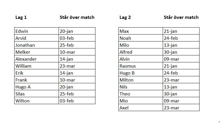 Hej! Efter jul blir det ändringar i de två lag vi har anmälda i serien. Det har börjat fler killar i år, vilket är jätteroligt! För att alla som åker iväg på match ska känna att dom får spela mycket har vi därför bestämt att två killar får stå över varje match. Bifogat hittar ni de nya lagen och vilken match som ert barn står över. /Ledarna P12 5 dec 2023 1kommentar