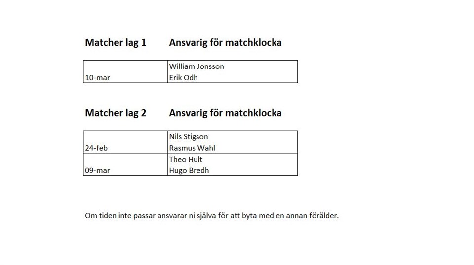 Hej, Vi har inte många hemmamatcher nästa år. Bifogat finns vem som ansvarar för matchklockan. Byt med varandra om ni inte kan. /Ledarna P12 5 dec 2023 0kommentarer