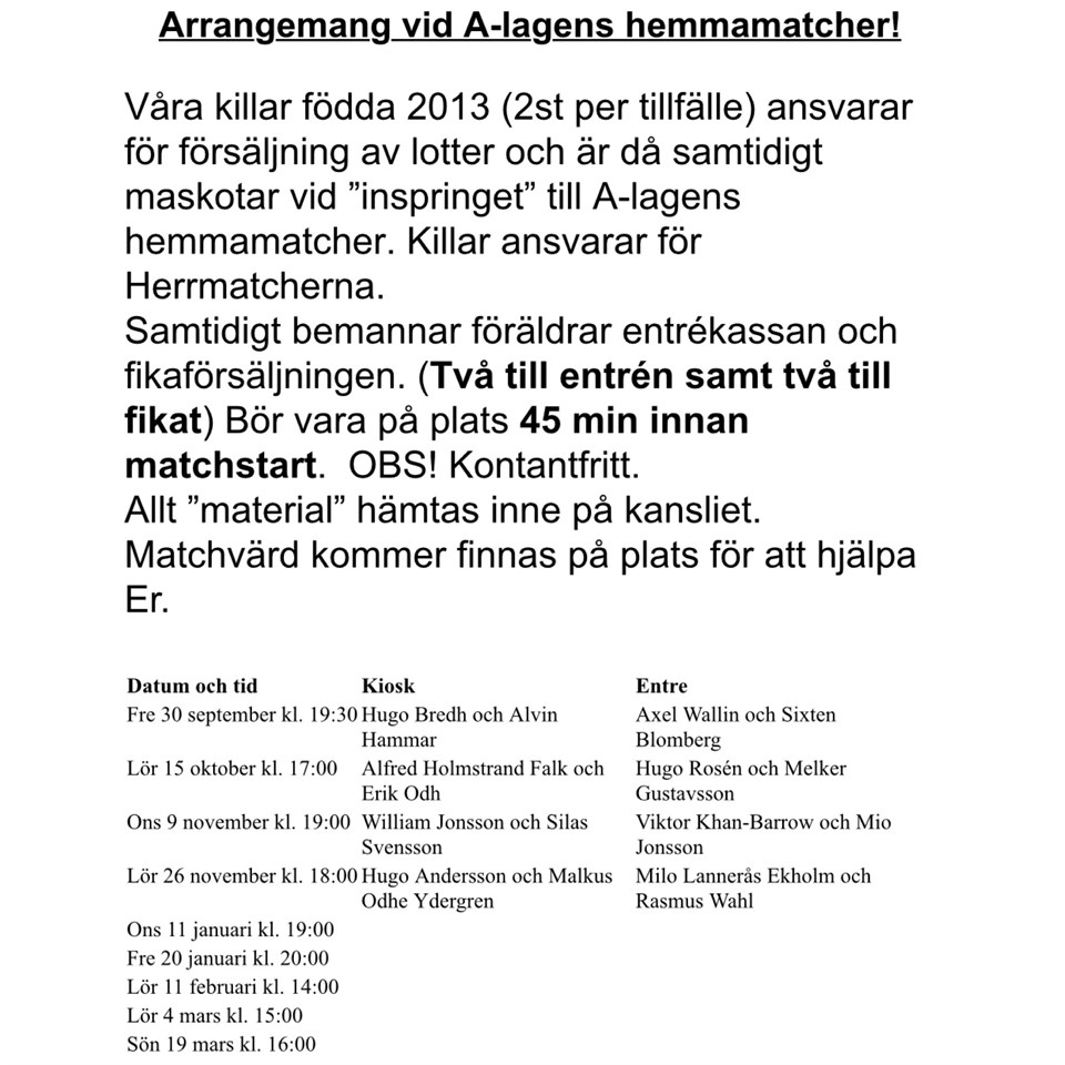 Hej! Killarna födda 2013 behöver i år INTE sälja kläder, ljus eller liknande men vi har i uppdrag att hjälpa till vid herrarnas A-lagsmatcher! Höstens matcher drar igång redan i slutet av september så här kommer en lista där matcherna är fördelade på barnen! Läs informationen så ni vet vad som gäller!!! (Finns även i bättre kvalitet under dokument!) Kan ni INTE det datum ni fått är det upp till ER att byta med någon annan i gänget!!!! Tack Hanna B som hjälpt oss med detta!!!!! /Ledarna