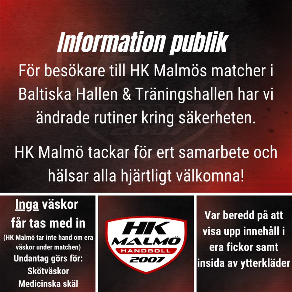 Hej. HK Malmö bjuder på handboll. Gratis inträde för spelare och ledare i HK Svalöv, övriga vuxna betalar 60:- (ord. 120-150:-). Skriv i kommentarsfältet om ni vill gå så beställer jag biljetter. Sista anmälningsdag för er är tisdagen 5/12. Det kommer att finnas en lista på både spelare och ledare som de använder när vi kommer dit. Samma för föräldrarna, skillnaden är de betalar med swish på plats. Föreningarna kommer att få en egen ingång vid entrén där man prickas av och släpps in. Tänk på att det råder väskförbud vid matchen, undantag för medicinska skäl samt skötväskor.
