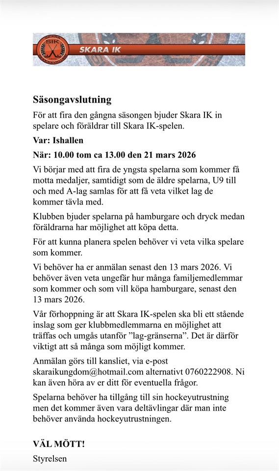 | Skara IK spelen. Avslutningsfest | 21 mar, 10:00 |