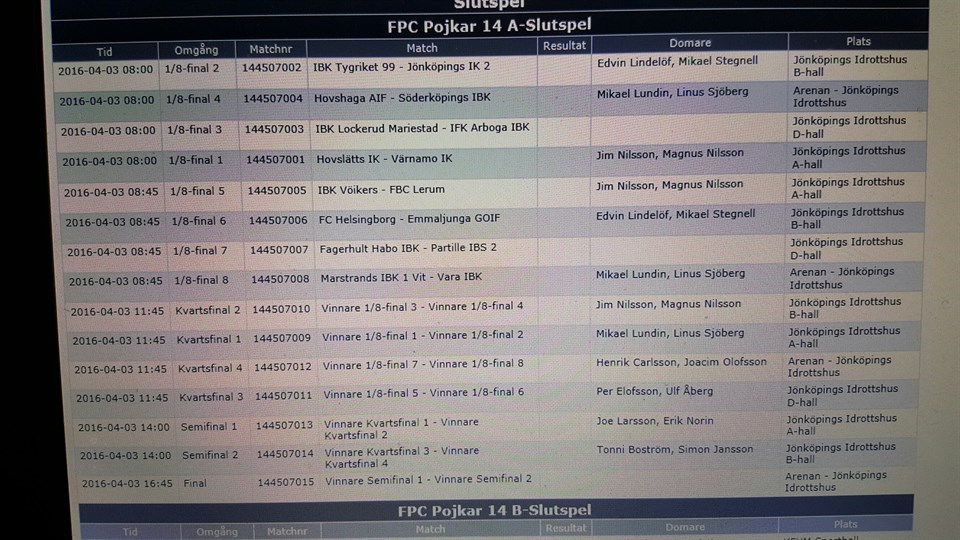 Efter fyra mycket stabila segrar blev vi gruppvinnare och spelar 1/8-final imorgon, matchstart 08:00. Samling 07:15 i entrén till Idrottshuset, vi spelar i A-hallen. Motståndare inte klart förrän sent ikväll (Värnamo IK blev det). Vid eventuell seger i den matchen går kvartsfinalen (i samma hall) kl. 11:45, så vi ser gärna att ni åker hem emellan dessa matcher och vilar (samling 11:00 vid seger på morgonen). Vinner vi båda dessa matcher går semifinalen kl. 14:00, tänk då på att äta ordentligt innan denna eventuella match och fylla på ordentligt med vatten. Går vi ända fram så går finalen kl. 16:45 i Arenan. Som sagt det var fyra stabila och rättvisa segrar, man var väl aldrig orolig någongång. Först seger ned 5-2 mot Crafstadens IBK Oskarshamn, sedan 7-1 mot Åsa IF, sedan 5-2 mot IFK Arboga IBK. Sedan i gruppfinalen mot Marstrands IBK vit som också hade tre raka vinster med målskillnaden 20-2 gjorde vi processen kort. Seger med 5-0! Nu samlar vi krafterna inför den spännande morgondagen!