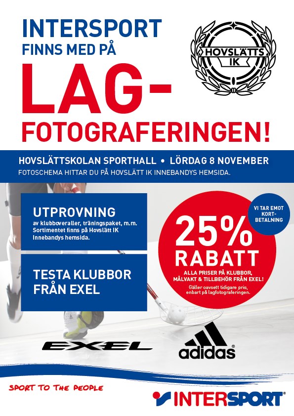 Hej P06 gänget. Lördagen den 8/11 kommer alla lag (20 st) att fotograferas i Hovslättskolans gympasal. Först kommer det att tas individuella bilder på alla spelare/ledare och därefter lagbild. Detta kommer att ta ca: 30-45 minuter/lag beroende på hur många spelare lagen har. P06 starttid för fotografering är kl.11.25. Vi samlas i hallen kl.11.15. Vi ska vara ombytta som om det vore match, skor, vita byxor, vita strumpor och en snygg frisyr (ta även med klubba till de individuella bilderna). Det finns ju två omklädningsrum men försök att komma ombytta så mycket som möjligt. Det kommer finnas en lite enklare ”kiosk” där, i P02:s regi, med kaffe, dricka, kaffebröd, korv och bröd m.m. Intersport kommer även vara på plats hela dagen. Test och köp av klubbor till kanonpris! Utprovning och beställning av overaller, träningspaket, och mycket mer. Betalning till intersport sker endast med kort.