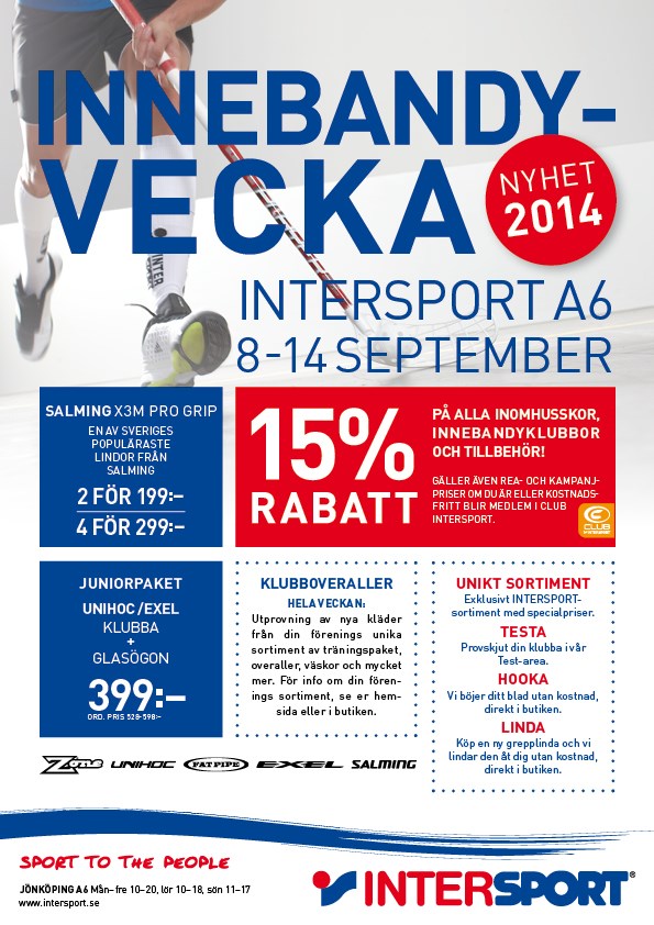 Hej P06 gänget. Innebandyvecka på Intersport A6 - vecka 37 (8-14/9). Många bra priser och rabatterade erbjudanden, bl.a. nytt för i år med 15% på ALLA priser på inomhusskor, innebandyklubbor och tillbehör. Även på REA och kampanjpriser. Guldläge att prova ut träningspaket, overaller, väska m.m. ur Hovslätts unika klubbsortiment från Adidas.