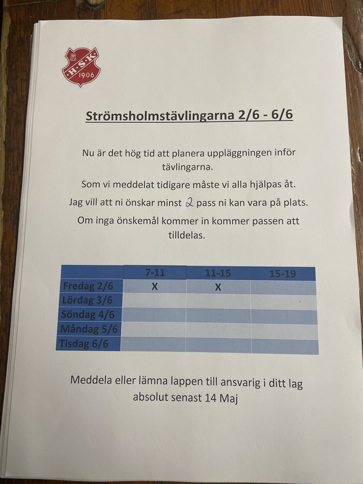 Hej, nu börjar det dra ihop sig till strömsholmstävlingarna 2-6 juni. Hsk kommer i år att ha hand om hästövergångarna och parkeringarna, vilket betyder att vi stoppar trafik, dirigerar trafik och tar betalt. Det innebär att vi alla behöver hjälpas åt föratt få till det. Jag vill att ni önskar minst 2 pass senast 14 maj. Mvh, Catrin 0736554947 Damer A-lag 22 apr 2023 0kommentarer