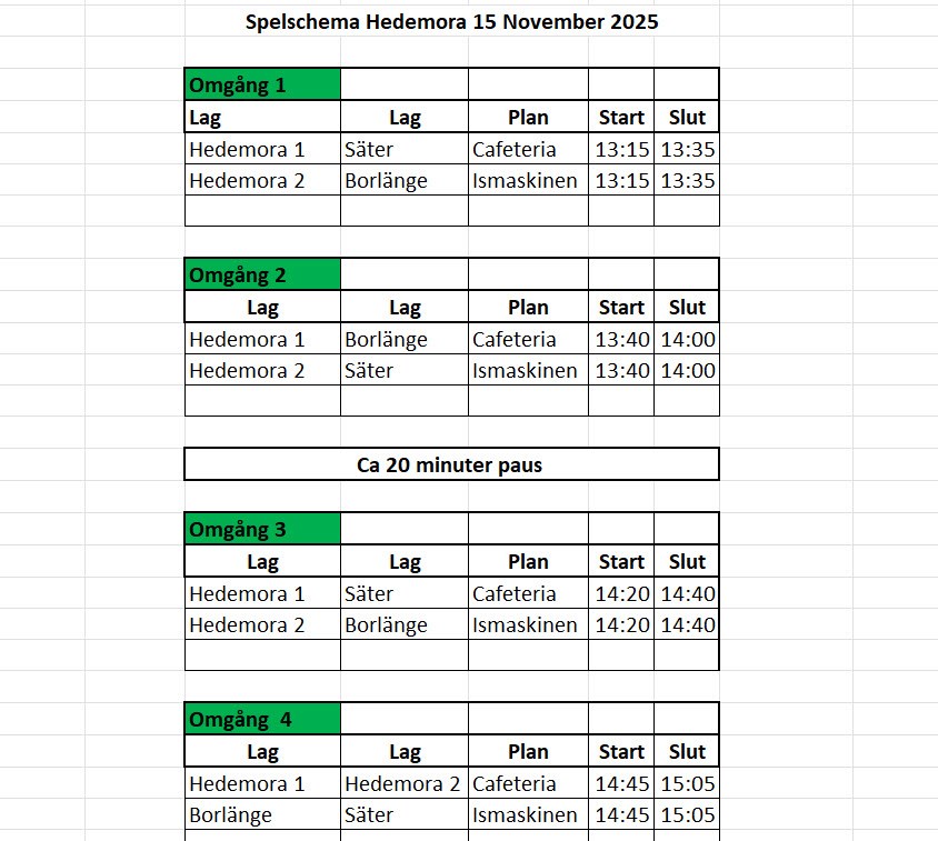 Hej Äntligen dags för match igen och vi kommer att arrangera denna gången. Matchstart 13:15 och vi har Borlänge och Säter på besök, Leksand kunde intte denna gången. Alla lag kommer spela 4 st matcher x 15 minuter. Vi kommer att behöva hjälp med följande. Jag har bett Jenny Ohls att hjälpa till så att vi har bemaning, hon kommer säkerligen skriva någon rad i våran messenger grupp angående detta. Vet man av att man inte är med i våran messenger grupp, så be Jenny eller någon annan i laget att bjuda in er. 1. Speakerbåset - 2 personer sköta klocka/musik (nya kan bli instruerade) 2. Cafeteria - 2 personer (kan kanske dela på tjänstgöringen där) så 2 st fram till pausen sen 2 st som tar efter pausen. Övrigt. Vi hade puckkastning senast vi arrangerade och vi fixade fram lite priser, detta är även möjligt att fixa med i den paus vi kommer att ha. Spelschemat finner ni bifogat. Ses i veckan.... MVH/ Ledarna U10 11 nov 2025 0kommentarer