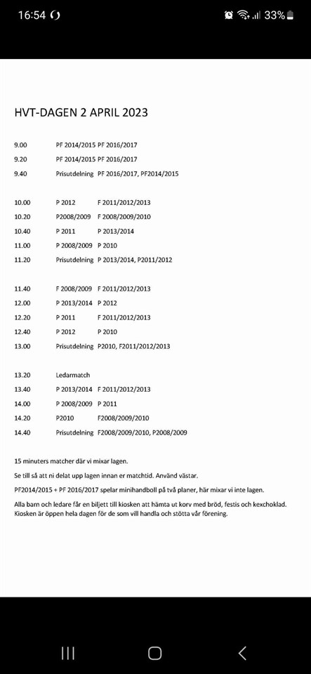 Här kommer lite info inför hvtdagen som är på söndag Gå gärna in på hvt ungdoms facebooksida där kan man anmäla sig till att hjälpa till i kiosken Annars kan man skriva här så vidarebefordrar vi det till berörda personer Det finns 3 pass att välja på 8:30-11 11-13:30 och 13:30-15:00 P11/12 26 mar 2023 0kommentarer