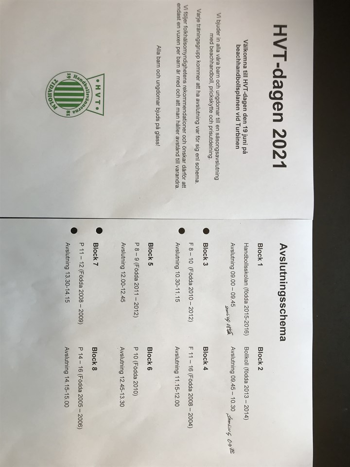 Hej på er, I mars fick handbollen ett väldigt snabbt slut pga coronaviruset och klubben kunde inte ha någon avslutning för alla barn och ungdomar men snart är det dags. Den 19 juni anordnar HVT en heldag på beachhandbollsplanen där varje lag har en egen tid för avslutning. Vi följer självklart folkhälsomyndighetens rekommendationer och önskar att max en förälder per spelare följer med till avslutningen för att vi ska kunna hålla nere antalet personer. Vårat lag har avslutning mellan 09.45-10.30 och vi samlas 09.30 vid Beachhandbollsplanen vid Turbinen. Kom ombytta till träningskläder. Se bifogad fil. /Ledarna P11/12 11 jun 2021 0kommentarer