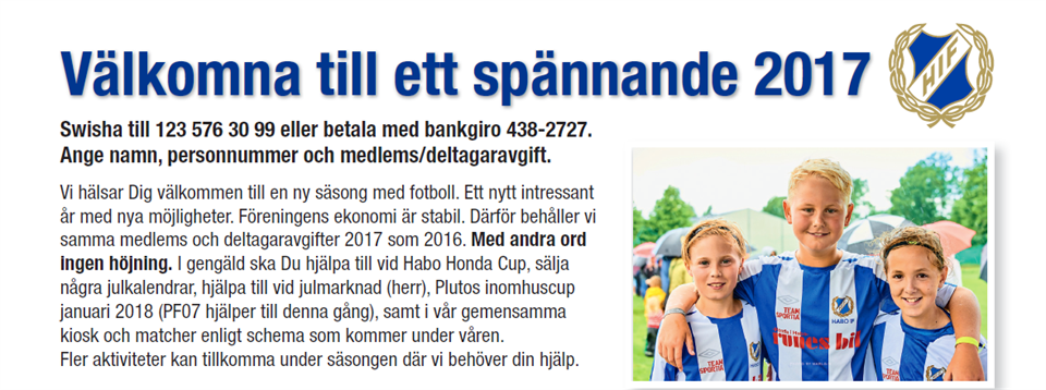 När vi nu går mot slutet av februari så vill vi påminna om: Årsmötet som hålls tisdag 21 februari kl 18 i klubblokalen. Medlemsbrev 2017 Om ni inte tagit del av utskicket med årets medlemsbrev så hittar ni nyheten och länk här. Ta del av viktiga datum som gäller för 2017. Supporterkort Passa även på att köpa supporterkort som ger dig rätt till fri entré till alla matcher på Slätten. Passa på nu när vi har herrarna i div 3 för första gången på nästan 40 år. Samt damlaget i div 3. Kontakta kansliet vid köp av supporterkort. Svenska Spel Vi passar på att påminna er som spelar att koppla era spelkort till Habo IF. Sponsorhuset Handlar du på nätet? Anslut dig till Sponsorhuset och koppla på Habo IF. Det tjänar ni och Habo IF på. Bingolotter Om du prenumererar på lotter koppla detta till Habo IF. /Habo IF styrelse Herr junior 20 feb 2017 0kommentarer