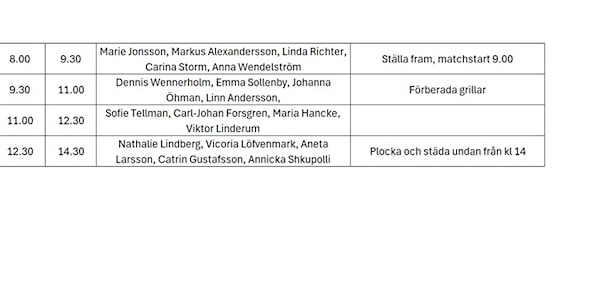 Vi kommer även behöva vara två matchvärdar under dagen och jag tänker att några av oss som står i kiosken kan hjälpa till med detta med. Innebär att ha en väst på sig som visar att man är värd och röra sig vid planerna så att allt går lugnt till 😊