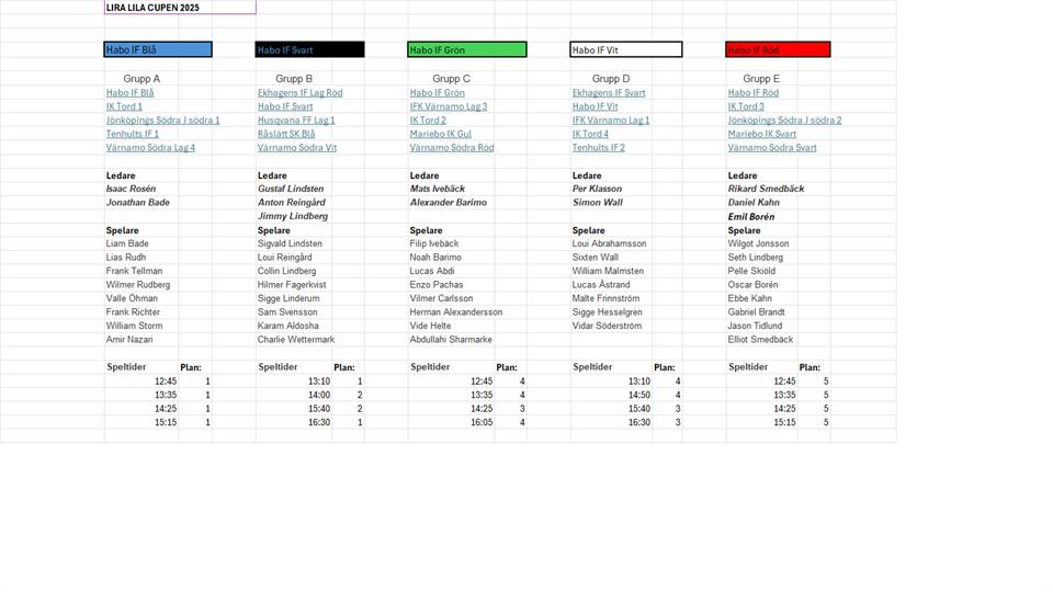 Här kommer information för dem som anmält sig till Lira Lila Cupen 2025 som går av stapeln nu på lördag, 3/5. Plats: Rosenlunds IP Spelupplägg: 5 mot 5. Speltid : 2 x 10 minuter. Vi har fem lag anmälda (Minst 4 matcher per lag) Strumpor och shorts tar ni med hemifrån, matchtröja tilldelas på plats. Kiosk och grill finns tillgängligt under hela dagen. Spelschema: Utöver länken till cupens websida finns även en bifogad fil med lagindelning samt speltider för respektive lag. Spelschema Lira lila cupen Vi samlas 45 min innan första matchen för respektive lag. Notera vilka ledare som är ansvariga för ert barns lag. Telefonnummer står inom parantes på ledarna, och det är dit ni hör av er vid ev återbud. Lagindlening: (finns även i bifogad fil) Habo Blå: Samling: 12:00 vid Plan 1. Ledare: Isaac Rosén (0703806676) Jonathan Bade (0737643519) Spelare: Liam Bade, Lias Rudh, Frank Tellman, Wilmer Rudberg, Valle Öhman, Frank Richter, William Storm, Amir Nazari Speltider: 12:45, 13:35, 14:25 & 15:15 Habo Svart: Samling: 12:25 vid Plan 1. Ledare: Gustaf Lindsten (0701461716), Jimmy Lindberg (0735393909), Anton Reingård (0722070109) Spelare: Sigvald Lindsten, Loui Reingård, Collin Lindberg, Hilmer Fagerkvist, Sigge Linderum, Sam Svensson, Karam Aldosha, Charlie Wettermark Speltider: 13:10, 14:00, 15:40, 16:30 Habo Grön: Samling: 12:00 vid Plan 4. Ledare: Mats Ivebäck (0707772645) Alexander Barimo (0735138957) Spelare: Filip Ivebäck, Noah Barimo, Lucas Abdi, Enzo Pachas, Vilmer Carlsson, Herman Alexandersson, Vide Helte, Abdullahi Sharmarke Speltider: 12:45, 13:35, 14:25 & 16:05 Habo Vit: Samling: 12:25 vid Plan 4. Ledare: Per Lyrin (fd Klasson) (0762678041) Simon Wall (0702366277) Spelare: Loui Abrahamsson, Sixten Wall, William Malmsten, Lucas Åstrand, Malte Frinnström, Sigge Hesselgren, Vidar Söderström Speltider: 13:10, 14:50, 15:40, 16:30 Habo Röd: Samling: 12:00 vid Plan 5. Ledare: Rikard Smedbäck (076-8967181), Daniel Kahn (0736277309), Emil Borén (0708786257) Spelare: Elliot Smedbäck, Wilgot Jonsson, Seth Lindberg, Pelle Skiöld, Oscar Borén, Ebbe Kahn, Gabriel Brandt, Jason Tidlund Speltider: 12:45, 13:35, 14:25 & 15:15 Vi ser fram emot en riktigt rolig dag tillsammans med grabbarna! Vi ses ikväll! / Ledarna