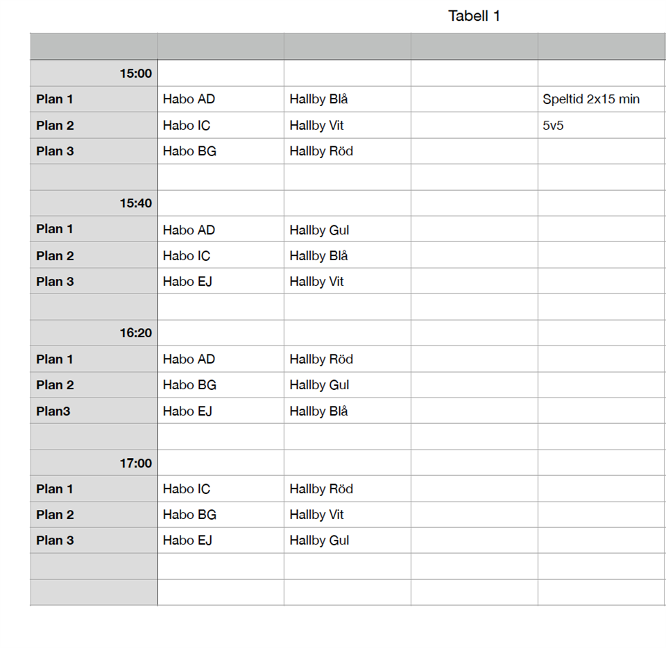 Hej! Nu börjar det närma sig Kabecupen den 18 Juni och vill delge lite kring tider och information. Allmän info När? 18 Juni. Mellan kl: 08:00 - 12:00. Var? Kabevallens gräs- och konstgräsplaner i Tenhult Spelregler: 5 vs 5 enligt Svenska Fotbollsförbundets regler. Matchtider: 1 x 18min Priser? Alla spelare får medalj Kiosk/Mat: Mat och fika finns att köpa. Grillarna står igång hela dagen. Glutenfria och vegitariska alt. finns! Ansvarig tränare för just din spelares lag håller i samling, utdelning av matchtröjor på plats etc. Gällande kontanthantering Vi kommer endast ta Swish och kort i kioskerna. Kontanter, jämna pengar (10:- kronor och 20:- lappar) kommer tas emot i aktiviteterna som finns under dagen. Bl.a Chokaldhjul och speedshooting. Mer info finns att tillgå på: https://www.laget.se/kabecupen https://www.facebook.com/kabecupen/ Specifik info Vänligen kom ombytta då omklädningsrummen är stängda. Matchtröja lämnas ut på plats. Ta med överdragskläder efter väder och mellan matcherna ansvarar inte ledarna för hanteringen av spelarna. Den planen som just din spelares lag spelar sin första match på kommer den även spela alla sina matcher. Rekommenderar att ni tar med mellanmål ev. måltid till spelarna då det är flertalet matcher under en längre tid. Vi har sammanställt de viktigaste dokumenten kring denna dagen under våran "dokument" flik här på sidan. Rekommenderar att ni tar en titt på dessa innan Lördagen: https://www.laget.se/HaboIFFP13/Document Här kommer lagindelningen och spelschema: Habo IF 1 - Samling 08:00 Plan 5 Ansvariga Tränare: Alexander Lonér, Joakim Svensson, Christian Sjöqvist Olle Lucas Emil L Jamie Oskar Lowe Sixten Rasmus Vilgot Mille N. Gustav 08:25 Habo IF 1 - Waggeryds IK 1 09:15 Tenhults IF 2 - Habo IF 1 10:05 IK Vista 1 - Habo IF 1 10:55 Bankeryds SK 2 - Habo IF 1 Habo IF 2 - Samling 08:00 Plan 7 Ansvariga tränare: Niklas Lixenstrand, Tim Vinneberg Jack Eddie Mio Hugo Devin lion Melker Aren Zacharias Elliot Vilmer 08:25 Mullsjö IF 1 - Habo IF 2 09:40 Habo IF 2 - Ölmstad IS 10:30 Lekeryds SK - Habo IF 2 11:20 Hovslätt IK 2 - Habo IF 2 Habo IF 3- Samling 08:15 Plan 8 Ansvariga tränare: Andreas Janeke, Tobias Gustafsson Casper Frank Deldar Ted Andre Julius Nassibo Iyad Tage Noah L. Mille S. 08:50 Habo IF 3 - Nässjö FF 4 09:40 Tabergs SK 2 - Habo IF 3 10:30 Ekhagens IF 2 - Habo IF 3 11:45 Egnahems BK 3 - Habo IF 3 Habo IF 4 - Samling 08:15 Plan 15 Ansvariga tränare: Markus Kvick, Veronica Johansson Adam K Tim Loui Daniel Axel Loke Colin Markus P Emil D. Vincent Milliam 08:50 Habo IF 4 - Mariebo IK 3 09:40 Norrahammar GIS- Habo IF 4 10:30 IK Vista 2 - Habo IF 4 11:45 Mullsjö IF 2 - Habo IF 4 Nu kör vi!!! \Ledarna Habo IF P13