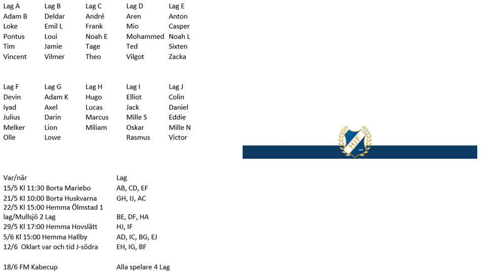 Hej! Våra huvudtränare har nu delat in spelarna i 10 stycken mindre grupper för att kunna enkelt matcha ihop till våra träningsmatcher, cuper etc. framåt. Detta så att alla ska kunna få speltid och vi får en jämn fördelning över hela laget och hela vårsäsongen. Bara de spelare och tränare som det berör blir kallade till angiven träningsmatch enligt schema! Kan man inte anmäler man sig enbart att man inte kan komma och vi tränare anvarar för inkallning av mer spelare. Inga byten etc. Dokumentet med matcher och lagindelning finns här med namnet "Matcher-Laguppdelning-2022_VS.docx" : https://www.laget.se/HaboIFFP13/Document Alla matcher och datum finns nu i kalendern. Kallelse kommer cirka en vecka inför varje träningsmatch akt. Samling osv. finns med i bokningarna Spelschema: 15/5 Kl 11:30 Borta Mariebo Grupper: AB, CD, EF 21/5 Kl 10:00 Borta Huskvarna Grupper: GH, IJ, AC 22/5 Kl 15:00 Hemma Ölmstad 1 lag/Mullsjö 2 Lag Grupper:BE, DF, HA 29/5 Kl 17:00 Hemma Hovslätt Grupper: HJ, IF 5/6 Kl 15:00 Hemma Hallby Grupper: AD, IC, BG, EJ 12/6 17:00 Hemma J-södra Grupper:EH, IG, BF 18/6 FM Kabecup Grupper; Alla spelare 4 Lag Laggrupper: Lag A Adam B Loke Pontus Tim Vincent Lag B Deldar Emil L Loui Jamie Vilmer Lag C André Frank Noah E Tage Theo Lag D Aren Mio Mohammed Ted Vilgot Lag E Anton Casper Noah L Sixten Zacka Lag F Devin Iyad Julius Melker Olle Gustav F Lag G Adam K Axel Darin Lion Lowe Lag H Hugo Lucas Marcus Miliam Emil D Lag I Elliot Jack Mille S Oskar Rasmus Lag J Colin Daniel Eddie Mille N Victor