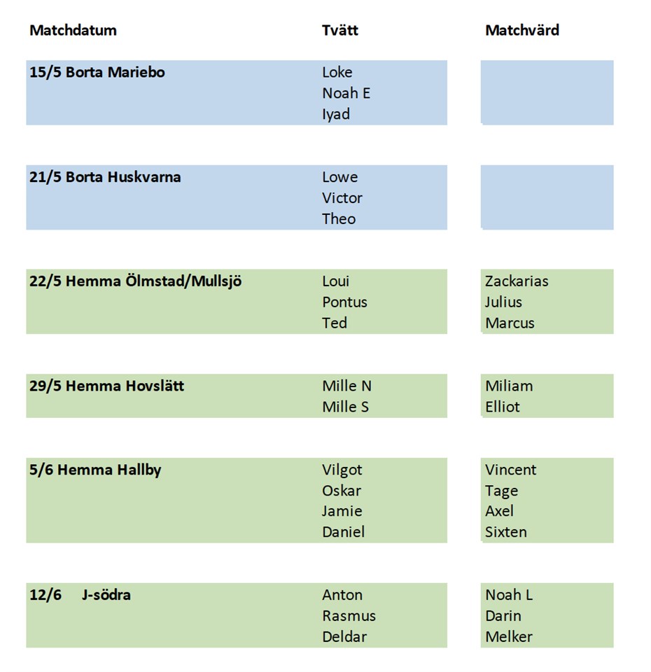 Hej alla, Lite påminnelse inför helgen: På lördag spelar 3 lag borta mot Huskvarna (Vapenvallen) på förmiddagen. Ni ska ha fått kallelse och samling är kl 9.10 på Willys parkering. Hör av er till ansvarig tränare för ert barns lag om ni har frågor. Se gärna till att killarna har med sig välfylld vattenflaska och något att fylla på med energi mellan matcherna. De får som tidigare en matchtröja att spela i, i övrigt ska de vara färdigklädda för match. På söndag är det hemmamatch som gäller. Då är några föräldrar kallade som matchvärdar, läs gärna igenom vad som förväntas av er inför detta. Vi samlas 14.30 på Slätten. Även här har det gått ut en kallelse. Se gärna till att killarna har med sig välfylld vattenflaska och något att fylla på med energi mellan matcherna. De får som tidigare en matchtröja att spela i, i övrigt ska de vara färdigklädda för match. På lördag är det 3 som är ansvariga för tvätt, det är mycket viktigt att vi har tillbaka dessa på söndag kl 14.30 på Slätten då vi behöver dessa till de 3 matcherna mot Ölmstad och Mullsjö. Alternativt lämnar ni dem hos mig på söndag förmiddag (ring innan 0706305459). Sedan är det 3 andra som ansvarar för att tvätta efter söndagens matcher. Ni hittar scheman för tvätt och Matchvärdar under dokument. Lycka till önskar vi alla spelare i helgens matcher!