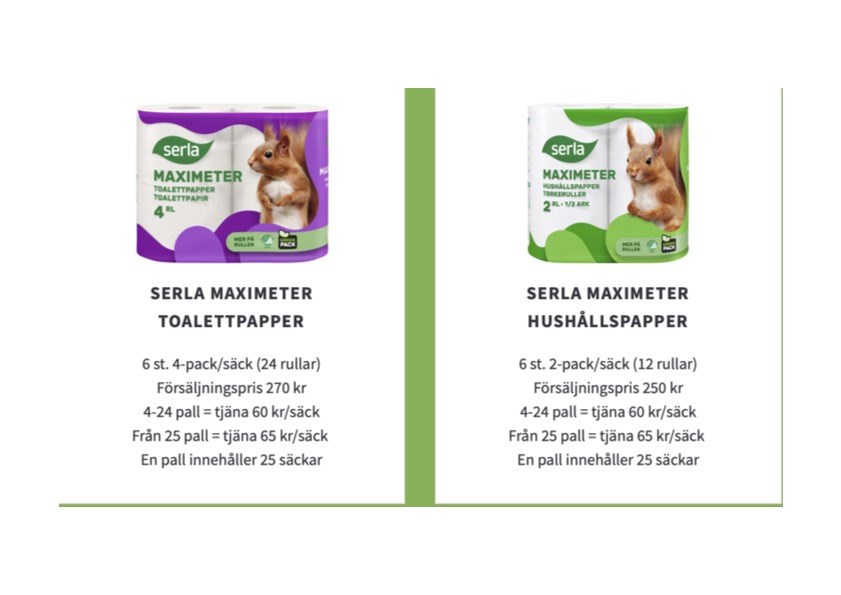 Priset för en säck toapapper är 270 kr och innehåller 24 rullar. Priset för hushållspapper är 250 kr och innehåller 12 rullar. Notera att detta papper heter Maximeter och innehåller mer papper per rulle än det som heter smart.