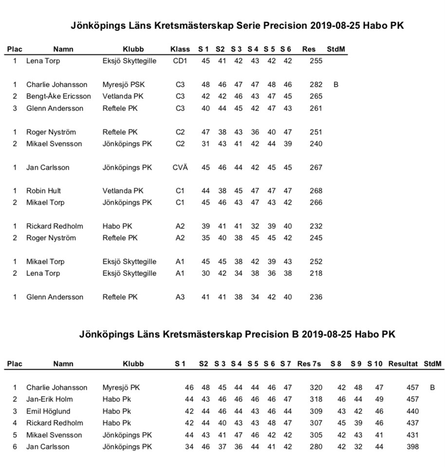 1. Jan-Erik Holm > 282 p. 2. Kent Larsson > 256 p. 3. Rickard Redholm > 255 p. 4. Hans Dahl > 248 p. 5. Emil Höglund > 231 p. Habo Pistolskytteklubb 3 okt 2019 0kommentarer