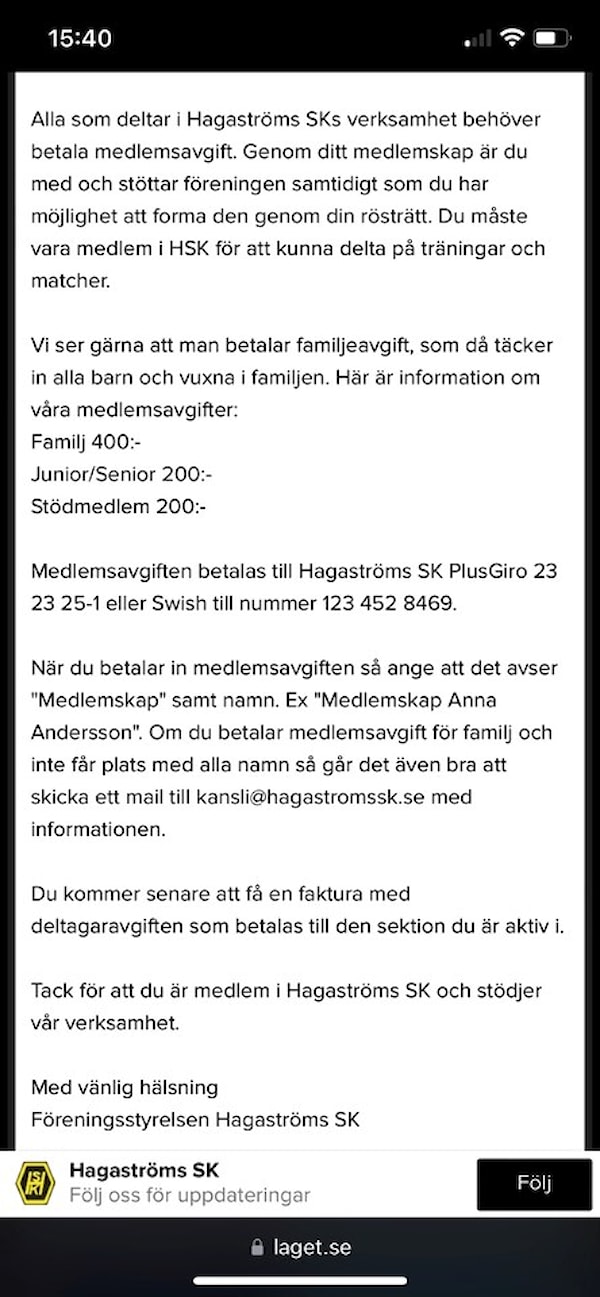 Medlemsavgiften betalas till Hagaströms SK PlusGiro 23 23 25-1 eller Swish till nummer 123 452 8469.