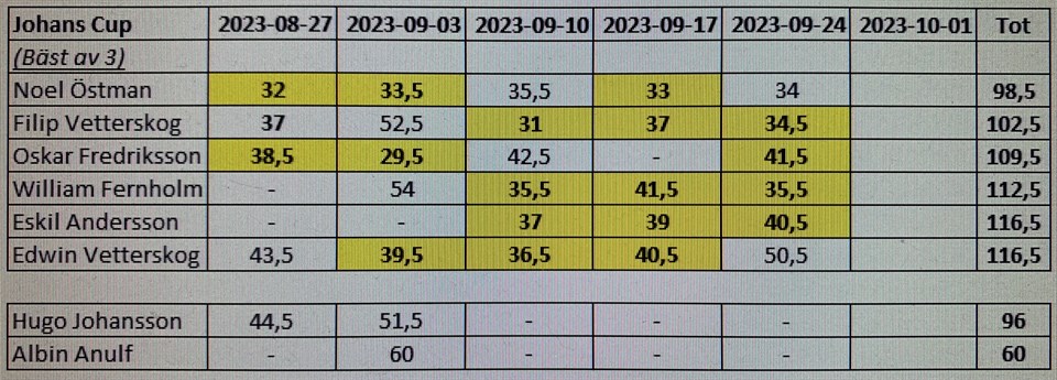 Resultat kvällens Johans Cup, resultat underst efter hcp-avdrag. /Peter Future killar 24 sep 2023 0kommentarer