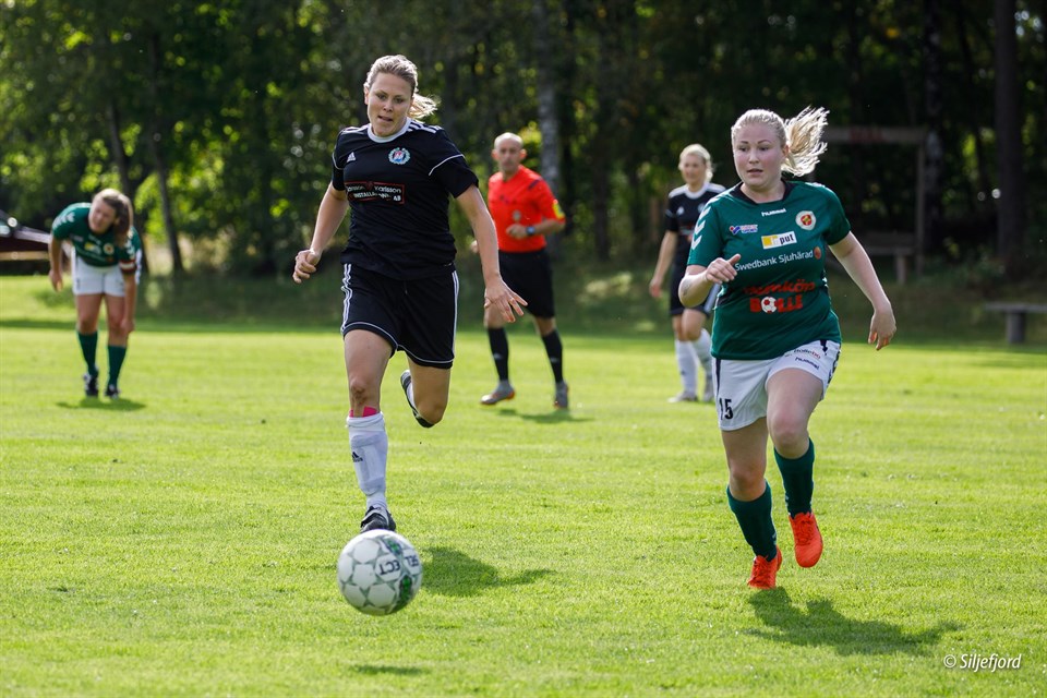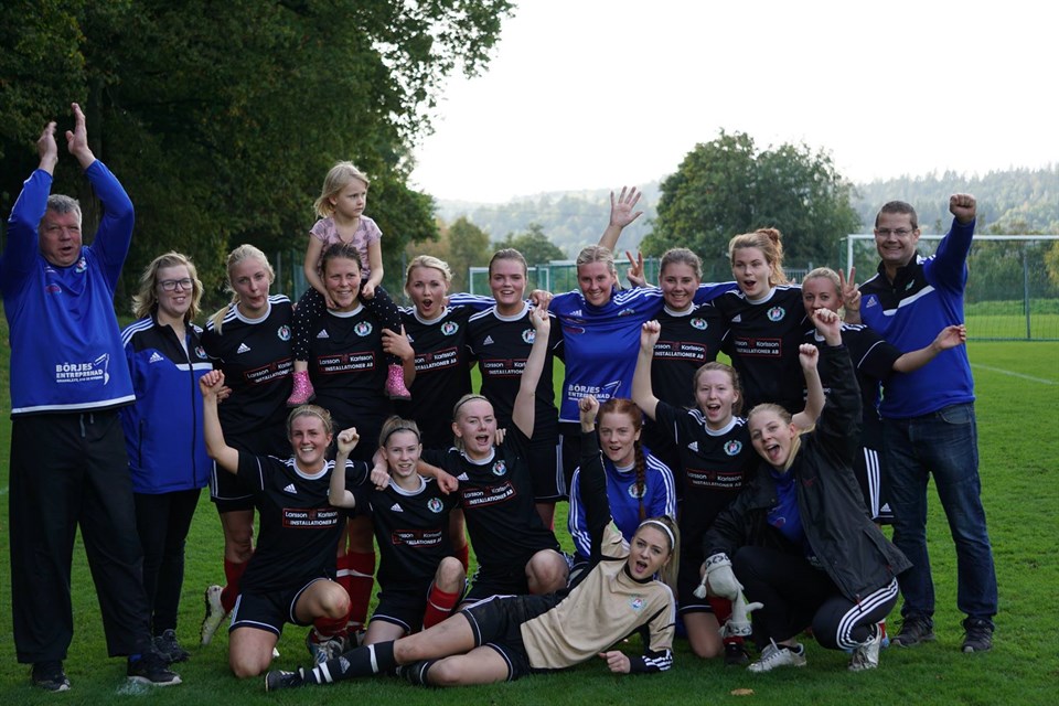 Då var det dags för sista matchen för säsongen för Hajom/Björketorp. För motståndet stod seriesegrarna Alingsås KIK. Så damerna visste redan innan att det skulle bli en tuff match till mötes. Domaren blåste igång matchen på en blöt och tung plan och till en början vad det otroligt jämt bland lagen. Hajom/Björketorp visade fina kombinationer och fina uppspel gång på gång. Vid en kvart spelat fick snöpligt nog Alingsås ett fint anfall och 1-0 var ett faktum. Men dem svarta gav inte upp. Återigen bjöd dem på flera fina uppspel och kombinationer och fysiskt spel. Helt oförberett fick Svea ett perfekt tillslag på bollen många meter utanför straffområdet och där kom 1-1. Det tog ett litet tag innan man greppade att det var mål. Måste varit säsongens mål! Båda lagen fick en väckarklocka vid Hajom/Björketorps kvitteringsmål, tyvärr var Alingsås snäppet vassare, otroligt köpstarka och snabba tjejer! Vid halvtidsvila stod det 3-1 till Alingsås. Andra halvlek bjöd Hajom/björketorp inte på så mycket men kämpade ändå på för varandra! Så vinnarskalle fanns kvar! Vid 80 minuten dribblade Helgesson fint ute på kanten och där kom även ett fint inlägg som Molin var först på! Målet var skönt att få för att visa att dem svarta fortfarande kämpar! Det var ett starkt och taggat Alingsås damerna mötte och Alingsås har verkligen förtjänat seriesegern. Hajom/Björketorp önskar Alingsås KIK lycka till i div 3 spelet nästa år! Det blev en tredje plats i tabellen för våra damer! Med ny energi som tillkom i våras har laget lyft sig, både som lag och individuellt! Säsongen 2018 kommer det att bli fortsatt spel i fyran, även möjligheter att utvecklas ännu mer. Väl mött!