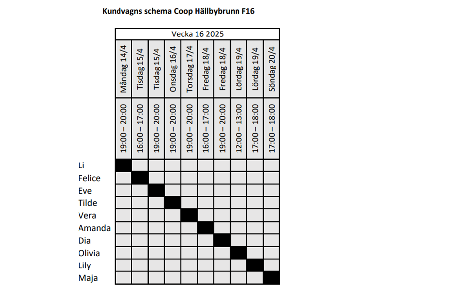 OBS! Uppdaterat schema. Vi har precis fått information om att det gjorts ändringar hos Coop, då Coop har rabatt på tisdagar så vill dom att vi kör 2 pass tisdag istället för på torsdagar som vi gjort förut. Då informationsdisken där ni ska inrapportera att ni dragit kundvagnar har nya öppettider från och med 1/3 så blir det ändrade tider för vår del. Schemat i bild är uppdaterat med de nya tiderna, det uppdaterade schemat finns även under dokument.