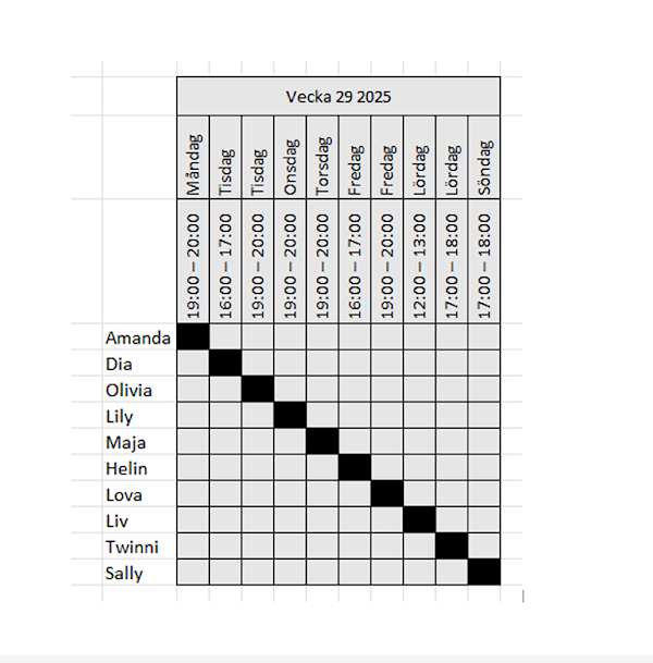I bilden ser ni vem som kör när (klicka på bilden för att se hela schemat), schemat finns även sparat under dokument.