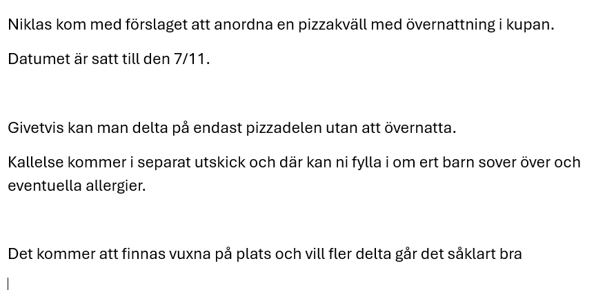 | Pizzakväll+övernattning | 7 nov, 18:00 |