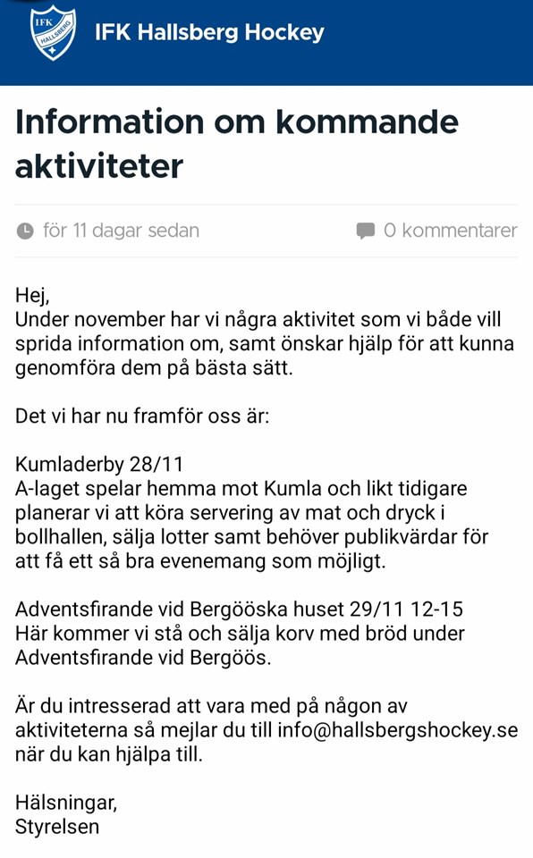 Klicka på bekräftelselänken i det mejl vi skickat dig för att börja ta emot uppdateringar från IFK Hallsberg Hockey U16(Team 10).