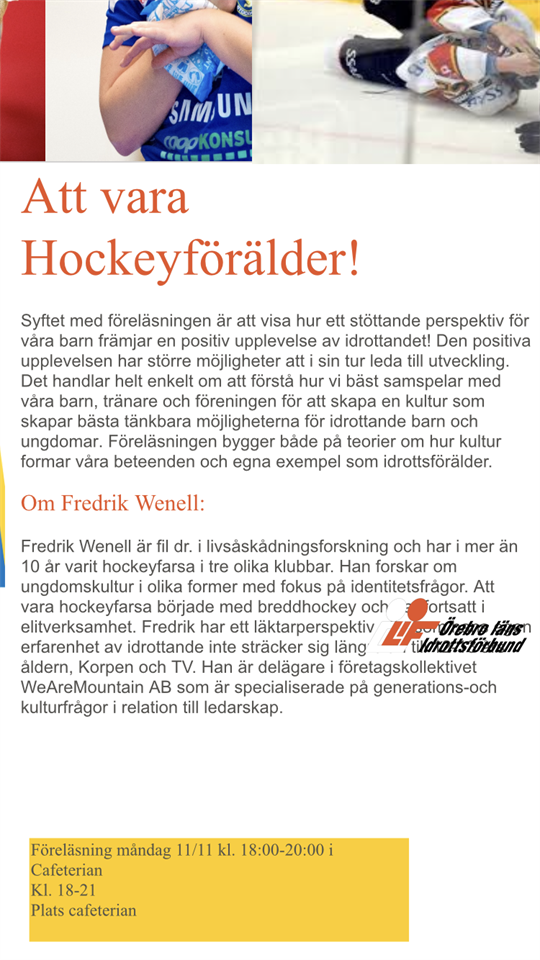 TIDER FÖR FOTOGRAFERING 14/11 2019 16.20??TRANAN 17.00??U9 17.20?Ish.skola 17.50??U10 18.10??U11+U12 18.40??U13-15 19.00?J18 19.25?J20 19.45?A-lag Se till att vara ombytta och klara för fotografering minst 5 min före planerad fotograferingstid men vänta utanför isen till fotografen kallar in Er. Lämna isen omedelbart efter att Ni är klara med fotograferingen. Allt för att fotograferingen skall gå så snabbt och smidigt som möjligt. Viktig Information inför fotograferingen från Fotograf Lars-Åke Johansson AB På vår hemsida www.larsake.se registrerar sig alla med tre uppgifter Namn, mail och mobilnummer Spelar man i två lag behöver man registrera sig i båda (gäller hockeyn) Sen skickar vi en inloggningskod till Spelarens/Åkarens bilder och beställningar kan göras Viktigt att alla gör det, alla namn behövs för laguppställningen (även ledare) 3 timmar innan fotograferingen stängs registreringen Eller gå in via denna länk http://www.larsake.se/lamna-uppgifter-infor-fotografering/