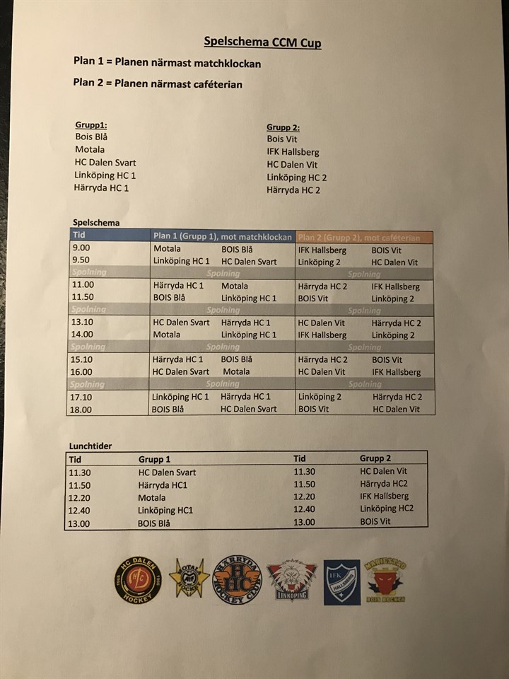 Hej! Här kommer lite info om lördagen! Barnen får lunch och ett mellanmål! Kan va bra att ta med nåt mer som frukt, yoghurt risifrutti! Samling 8 i Mariestad ishall. Kör försiktigt det verkar bli kallare till helgen! Välkommen till CCM Cup i Mariestad den 30 november 2019 för U10 (spelare födda 2010 och senare) Cupen spelas på halvplan med 4 utespelare och 1 målvakt. Cupinfo: 10 lag som fördelas i 2 grupper, 2 mather spelas samtidigt. Speltiden Är 2 x 15 minuter med 90 sekunders tutbyten. Tiden stannas vid byten. Alla lag möter lag i gruppen vilket innebär att alla lag spelar 4 matcher. Alla spelare får medalj och alla lag är segrare!