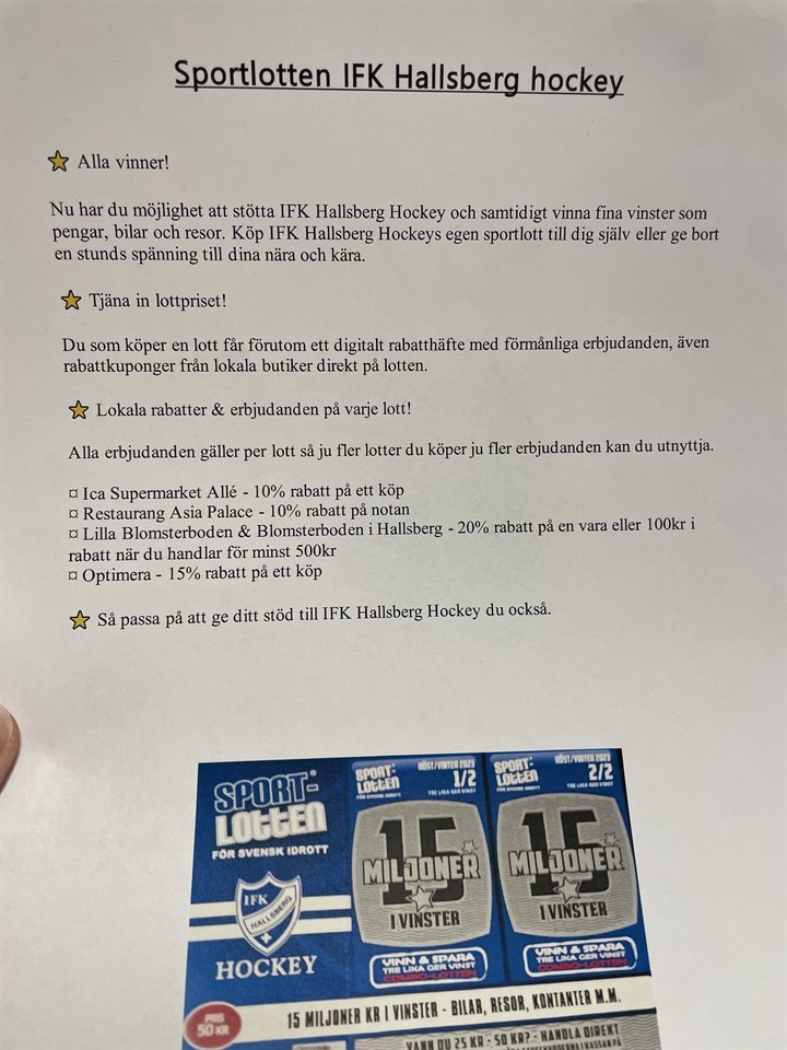 Hej alla! Idag delades sportlotten ut till de föräldrar som var på plats. Detta är en obligatorisk försäljning till föreningen. De barns föräldrar som inte fått är Lucaz Larsson Olle Mogren Harry Axeliusson Ni får era lotter nästkommande träning. Lotterna kostar 50kr/styck och ni ska sälja totalt 10 st. Totalt per barn blir det 500kr som ska betalas i en klumpsumma till mig, Camilla Hoppman senast 31 december. Ni kan swisha till 073-7779863 VIKTIGT! Skriv i meddelanderaden ert barns namn! Behöver man fler lotter säg till! Har ni frågor kan ni skriva en kommentar, skriva i whatsapp eller skicka sms Camilla: 073-7779863 Amanda: 070-0150717 Ha en bra helg! // Camilla & Amanda