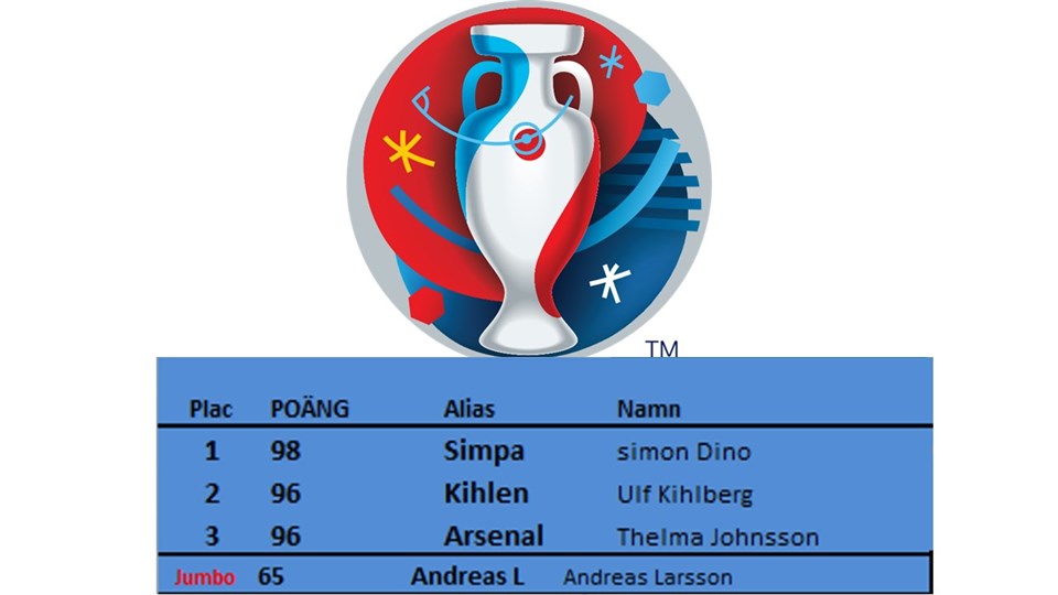 Ja, då var det avgjort. Simon Dino klättrade upp som ensam 1:a till slut, ett stort grattis! På samma poäng kom Ulf Khilberg och Thelma Johnsson, men eftersom Ulf var närmast i antal mål, så slutar Ulf 2:a, och Thelma 3:a. Lika rafflande var det i botten, där Anderas Larsson och Tony Blom krigade om sistaplatsen. Samma poäng, oxå där avgjordes det på antal mål. Tony var 30 mål ifrån, och Andreas 31 mål ifrån. Andreas Larsson JUMBO. En hade Portugal som Europamästare, och det var Sofia Nordin. Antal mål under EM: 108st Skytteligan: 1:a Griezmann 2:a Ronaldo, Giroud, Nani, Payet, Bale, Morata 3:a Nalnggolan, Perisic, Blaszszykowski, Stancu, Robson-Kanu, Gomez, Dzsudzsak, Pelle, Brady, Lukaku, Sigthorsson, Bjarnason EM Tipset Det är mycket formler och manuella uppdateringar, så kolla gärna igenom era rader/poäng, och återkom inom ett dygn, så rättar vi ev fel. Mvh Tipskommiten