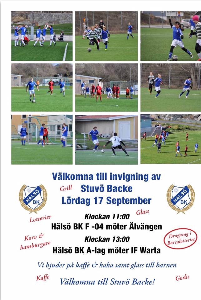 Välkomna till invigning av Stuvö Backe Lördag 17 September Klockan 11:00 Hälsö BK F -04 möter Älvängen Klockan 13:00 Hälsö BK A-lag möter IF Warta Vi bjuder på kaffe & kaka samt glass till barnen Välkomna till Stuvö Backe!
