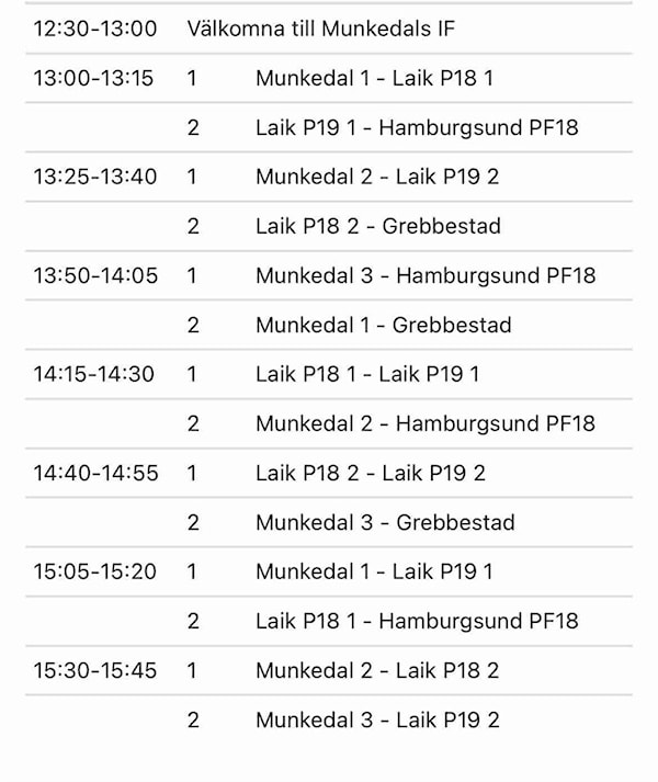 Vi har ändrat samlingstiden till 12.15 (tidigare 12.00). Viktigt att alla är på plats i tid så vi hinner byta om och värma upp innan första matchen.