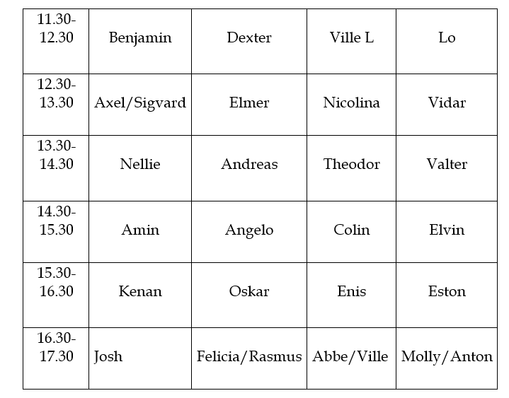 Planerar att göra schemat ikväll så dom som inte önskat tid antar jag kan när som helst under tiden. Lägger ett inlägg här med schemat.