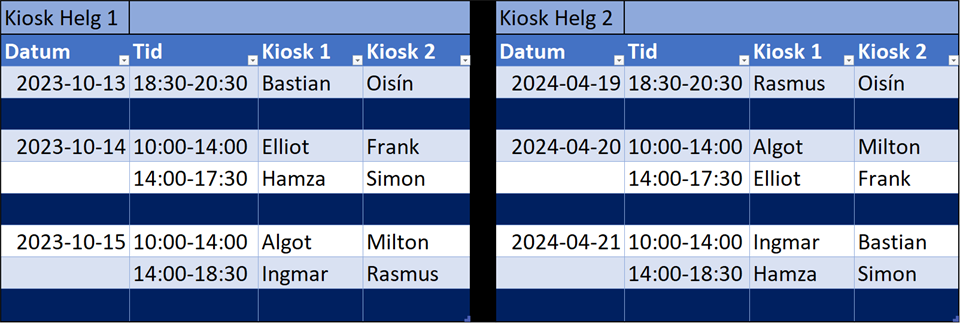 Hej! Nu är det dags för kioskpass! Vi har fått två hela helger tilldelade oss och jag har planerat så rättvist jag kunnat, se bild. Sekretariat- och kioskschema Schemat ligger också under dokument på vår sida. Se till att prata med coach Johan eller Simon om att låna tagg, om ni är de som öppnar kiosken! Kioskrutin Ersättningslista Dessa dokument ligger under HBK:s huvudsida. Arvode ses över även för kioskpassen, återkommer i kommentarerna när jag vet detta. Nytt för i år är att vi inte kommer hantera toast utan utöver dricka, chips, chokladbollar osv så är det korv samt Billys som är det som är varmt som kommer att serveras. Nya uppdaterade rutiner för hygien och livsmedelshantering finns att läsas som står i pärmar i kiosken. HBK P10 26 sep 2023 0kommentarer