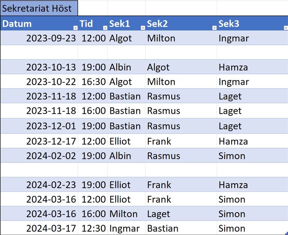 UPPDATERAT Matcherna mot Åmål borttagna. Återkommer med ersättningslistan när jag fått den. ----------------------- Dags att börja bemanna sekretariatet om några veckor. Schemat ligger under "Dokument" som vanligt. Jag hoppas och tror att alla matchändringar är genomförda. Sekretariatet ska bemannas av tre personer. De ska vara på plats ca 35-40 minuter innan matchstart för att ställa i ordning all utrustning. Behöver man byta pass med någon löser ni det själva mellan varandra. Har man inte sekretariatsutbildning eller vill slippa passet ber vi er kolla med någon ungdom i föreningen om de kan ta passet mot en kostnad på X kr, ersättningsnivån ses över detta år. Återkommer i nytt inlägg med listan för ersättare då den uppdateras efter kommande helgs utbildning. HBK P10 18 sep 2023 2kommentarer