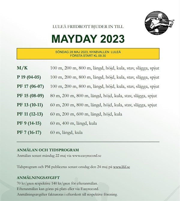Söndag den 28 maj arrangerar Luleå Friidrott säsongens första utomhustävling - Mayday