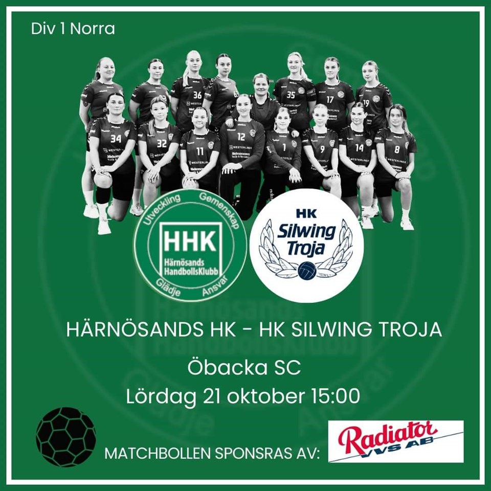 På lördag välkomnar vi HK Silwing Troja till Öbacka - ny match, ny utmaning! Från sena onsdagsträningen kan rapporteras bra fart och taggade spelare 💥 Glädjande nog har vi också flera som gör comeback i HHK-gemenskapen, så roligt! 💚 Och så hoppas vi förstås på publikens viktiga stöd även denna match, varmt välkomna! Matchbollen sponsras av Radiator VVS - stort tack! ___________________ Entre: Vuxna 80:- Pensionärer 60:- Barn, gymnasieelever och aktiva spelare & ledare i HHK & BHF kostnadsfritt. Årskort 600:- Årskort pensionärer 460:- Endast Swish Härnösands HF 19 okt 2023 0kommentarer