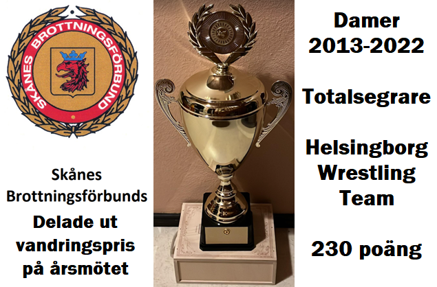 Skånes Brottningsförbund:s vandringspris Damer 2013-2022 Totalsegrare 2013-2022 Helsingborg Wresling Team med 230 Poäng. Efter distriktsmästerskapen 2022 är poängställningen: Hela listan: 1 Helsingborg WT 230 2 BK Ore 115 3 Dalby BK 99 4 BK Atle 74 5 Svedala BK 55 6 EAI Brottning 54 7 Klippans BK 41 8 BK Viking 41 9 BK Envig 25 10 BK Velo 24 11 Bjuvs BK 19 12 Sösdala BK 18 13 BK Trim 15 14 Ballingslövs BK 11 15 IK Sparta 11 16 Limhamns BK 7 17 Hästveda BK 5 18 Höörs BK 5 19 Kävlinge/Furulunds BK 4 20 Björnekulla BK 4 21 IK Dana 3 22 BK Pan 3 23 Skurups SK 3 24 Karlshamns BK 3 25 BK Starke 3 26 Tyringe AoBK 3 27 Hököpinge BK 2 28 HBK Bergania 2 Helsingborgs Wrestling Team 27 mar 2023 0kommentarer