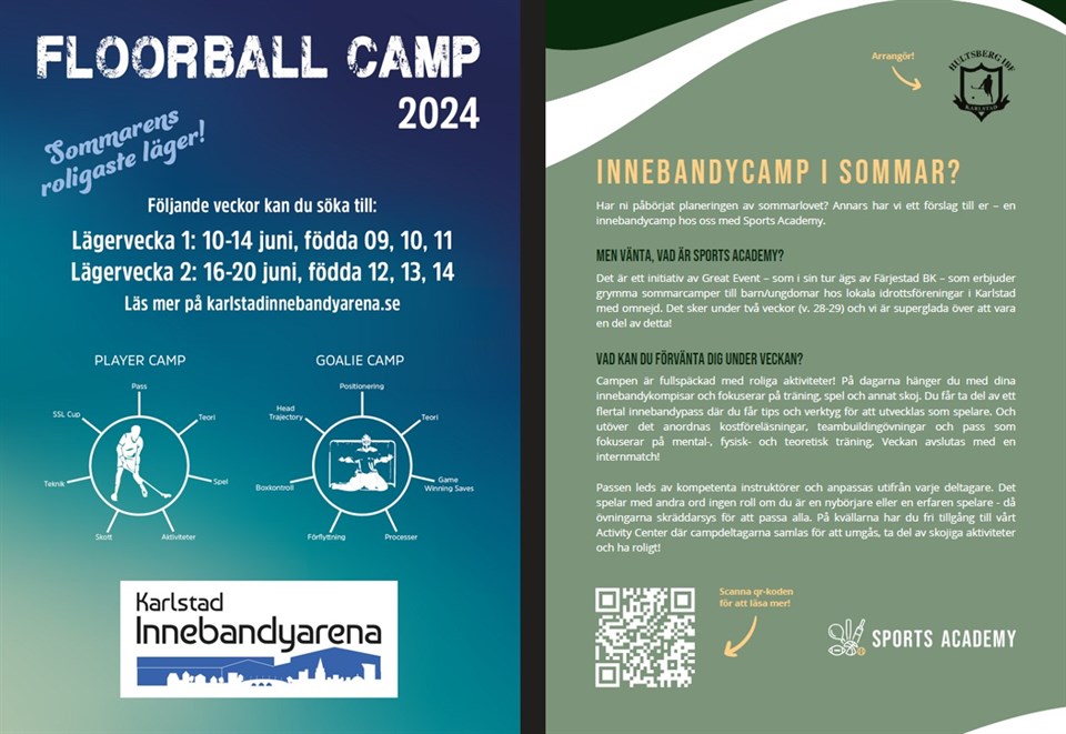 Vi vill tipsa om två sommarläger som finns att anmäla sig till här i Karlstad. Dessa läger är mycket utvecklande för barnen innebandymässigt och ger även många nya innebandyintresserade kompisar. Herrhagens IF har är inte en av de arrangerande föreningarna och har ingen annan koppling till dem än att vi ser positivt på att de som vill och kan är med. Brukar vara ett gäng barn från Herrhagens IF som är med och är man flera kan man turas om med skjuts etc. De två lägren vi fått information om är: Floorball camp för barn födda 2012-2014 Arrangeras i Tingvallahallarna 16-20 juni av Karlstads innebandyarena (Karlstads IBF, Skattkärr m.fl) Länk till anmälan Floorball camp 2024 Sports academy för barn födda 2012-2017 Arrangeras av Hultsberg IBF v. 28 och 29 och man kan välja att delta hel- eller halv vecka. Länk till hemsidan P 2015/2016 18.30-19.30-gruppen 15 feb 2024 0kommentarer