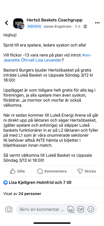 Under mellandagarna anordnas en cup i Luleå energi arena. Brukar var en uppskattad cup att vara med på. Kommer skicka ut en kallelse till detta. Svara gärna så fort som möjligt så jag vet hur många som kan vara med och om vi behöver anmäla två lag. F-15 18 nov 2023 3kommentarer
