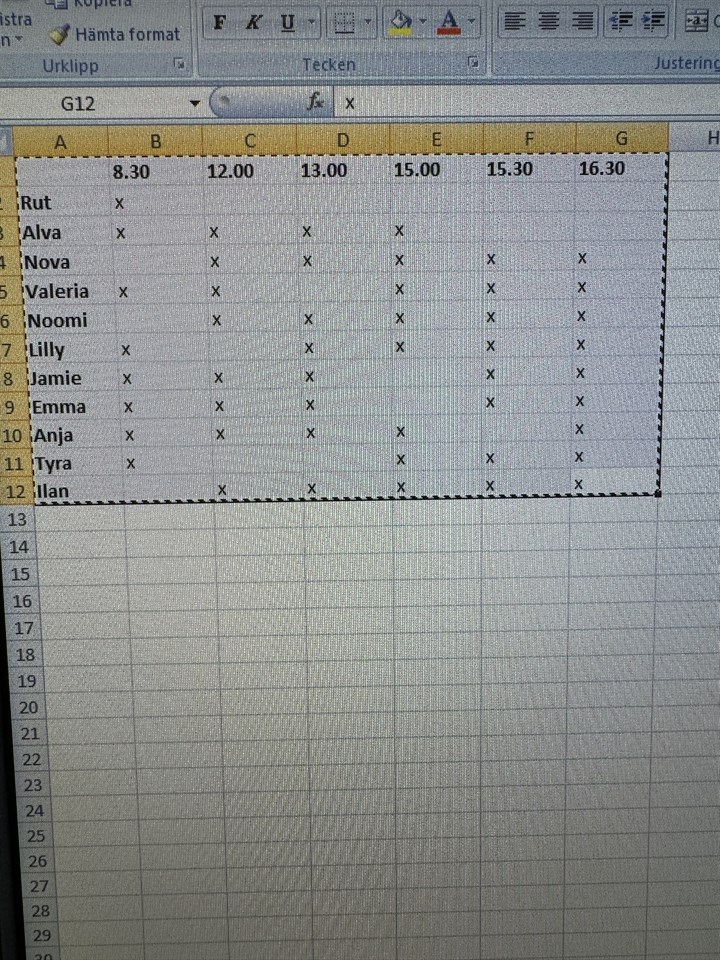 Hej! utifrån att vissa ej kan delta alla matcher och för att det ska bli jämt fördelat med speltid under själva matcherna har jag gjort schema för vilka matcher varje barn ska spela. Vi samlas i Gammelstads sporthall, bredvid badhuset, 30 min innan matchstart. x= spelar tom ruta= vilar just den matchen. F-15 2 nov 2023 3kommentarer