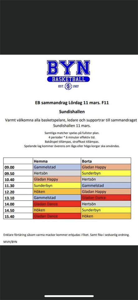 Hej hej. Nu har spelschemat kommit, vi spelar i Sunderbyns sporthall denna gång. Samling kl 9.20 Matchtider 9.50 - Sunderbyn 10.40 - Gladan Happy 14.00 - Gladan dance
