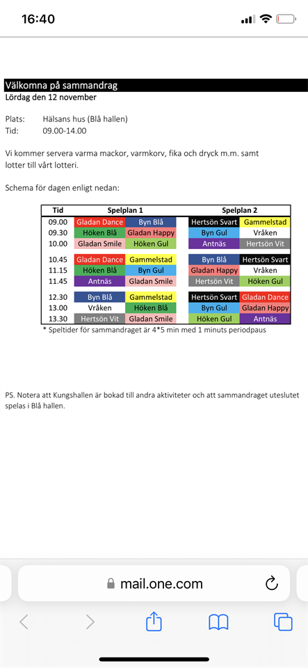 Hej Nu har vi fått spelschema för lördag. Vi har denna gång med två lag, Hertsön svart och Hertsön vit. Hertsön svart; Enya, Nelly, Saga, Jackie, Elham, Wilma P och Astrid. Hertsön vit; Wilma M, Lova, Helen, Alma, Klara och Muqddas. Vi håller ihop och hejar på varandra under dagen. Aktuella tider för oss Kl 9. Hertsön svart - Gammelstad Kl 10. Hertsön vit - Antnäs Kl 10.45. Hertsön svart - Byn blå Kl 11.45. Hertsön vit - Höken gul Kl 12.30. Hertsön svart - Gladan dance Kl 13.30. Hertsön vit - Gladan smile Samling ombytta och redo kl 8.40 för Hertsön svart. Vita laget samlas kl 9.30 Vi ses också imorgon på Luleå basket matchen för de som har möjlighet att komma.