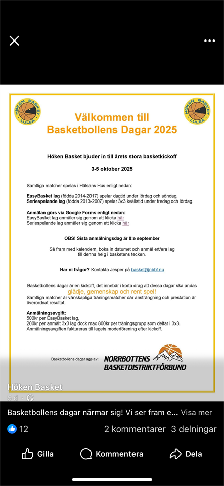 Hej Nu börjar träningstider och datum för hemmamatcherna fall på plats. Under säsongen har vi dessa träningstider; Måndagar kl 19-20, Hälsans hus. Kungshallen Tisdagar kl 17-18, Luleå Energi Arena. B-hallen. Torsdagar kl 20-21, Hälsans hus, Blå hallen. Dessa träningstider finns från nästa vecka. Vi kör troligtvis två träningar till veckan då fotbollen också har träning fortf. Se på kallelse vilka det blir. Har inte lyckats lägga in matcherna i laget.se än då det inte går att välja rätt serie. Ska försöka fixa med det. Här är iaf våra hemmamatcher fram till jul. Vi spelar i DU3 denna säsong. 11 oktober kl 8.30 Örnässkolan. Hertsö basket-Brooklyn 19 oktober kl 13, Örnässkolan. Hertsö basket - BYN 14 december kl 8.30 örnässkolan. Hertsö basket - Höken 18 december kl 20, Hälsans hus, Blå hallen. Hertsö basket - Gladan Sist ett tips om att gå och se BC Luleå hemmapremiär nu på fredag. PREMIÄRTÅG FRÅN STADSPARKEN! 🚂 BC Luleås huvudsponsor LKAB bjuder alla som går i premiärtåget på inträdet till BC Luleås premiärmatch fredagen 19 september. Vi samlas i Stadsparken klockan 18:00 på matchdagen. Där delas fribiljetter ut och sen marscherar vi tillsammans i vårt klassiska premiärtåg till Luleå Energi Arena vid 18:15. Även personer som redan har biljetter ska självklart gå med i tåget. Alla är välkomna! Det här är ett samarbete mellan BC Luleå, Luleå Basketcentrum, Norrbottens Basketdistriktsförbund & LKAB.